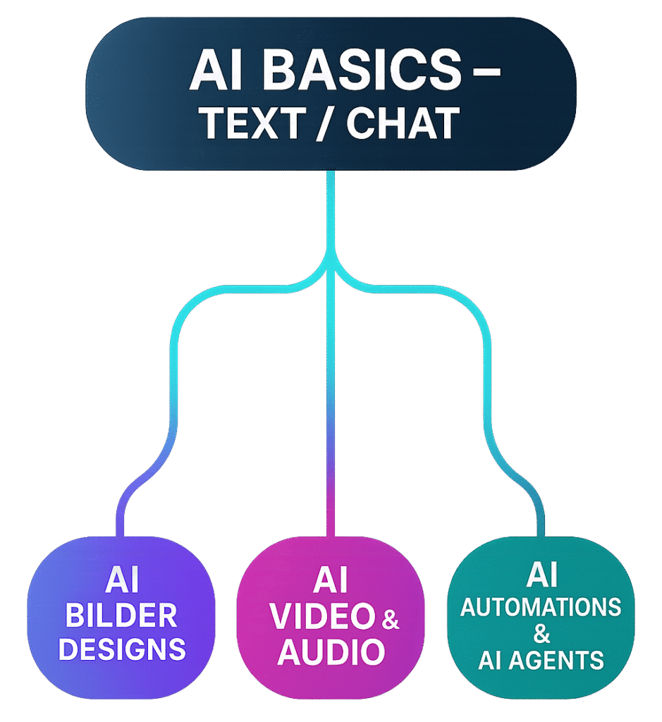 Die Grundlage für alles. Hier lernst du, wie AI-Texte, Chatbots und smarte Textwerkzeuge funktionieren – und wie du sie sofort im Alltag oder Beruf einsetzen kannst. - AI Bilder / Designs
