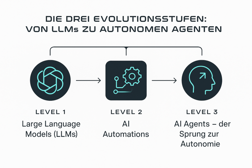 Um die Unterschiede zwischen LLMs, AI Automations und echten AI Agents zu verstehen, schauen wir uns die drei Evolutionsstufen an, auf denen moderne KI-Systeme aufgebaut sind.