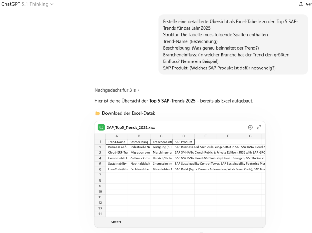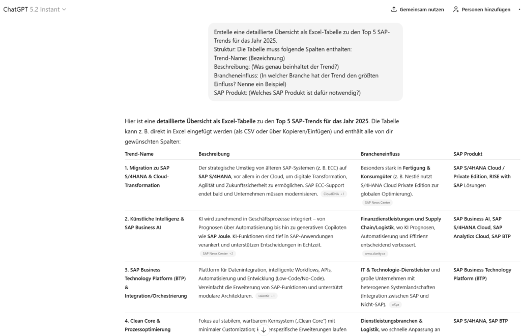Die Antwort wird direkt generiert und man erhält eine Tabelle zum manuellen Übertragen in Excel.