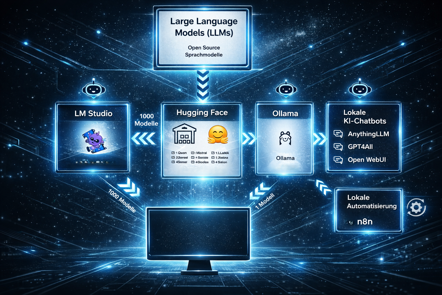 Hier kommen Ollama und LM Studio ins Spiel, die beide als Vermittler zwischen dir und dieser Modellvielfalt fungieren. Ollama funktioniert dabei wie ein kuratiertes Museum: Das Team wählt aus der Fülle an Modellen die besten aus, optimiert sie für den Alltag und macht sie mit wenigen Klicks nutzbar. Du bekommst also eine übersichtliche Auswahl getesteter, zuverlässiger Modelle – perfekt, wenn du nicht stundenlang recherchieren möchtest. Ein zusätzlicher Vorteil: Ollama richtet die Modelle so auf deinem Computer ein, dass auch andere Programme darauf zugreifen können. So kannst du beispielsweise lokale Chatbots wie AnythingLLM oder Automatisierungstools wie n8n mit denselben Modellen betreiben.