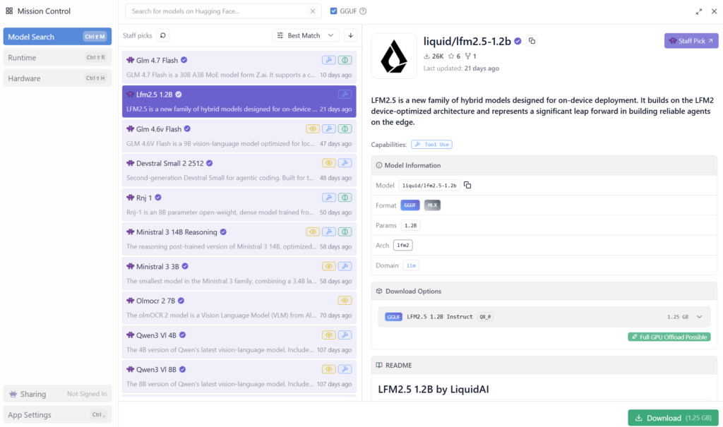 Besonders hilfreich für Einsteiger: Modelle mit einem lila Häkchen sind von LM Studio empfohlen. Sie wurden gründlich getestet, laufen stabil und sind gut optimiert. Perfekt für den Start!