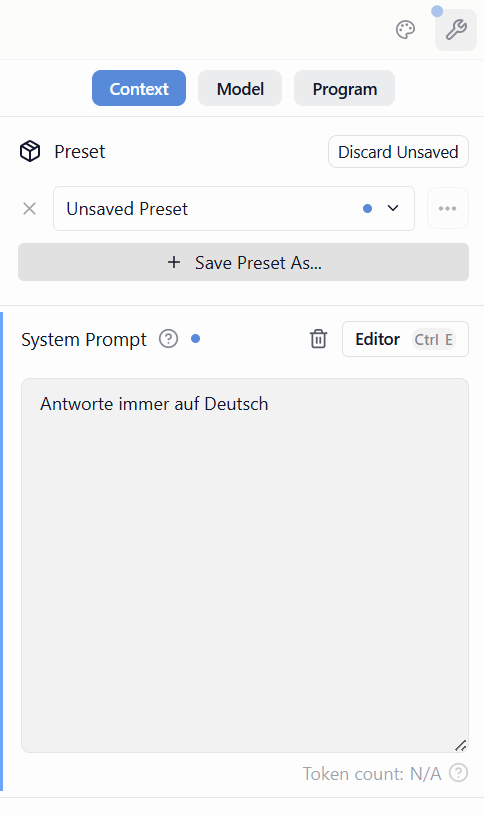 Über das Icon rechts oben kannst du solche Systemprompts hinterlegen. Schreibst du dort zum Beispiel „Antworte immer auf Deutsch“, wird das Modell diese Vorgabe befolgen.