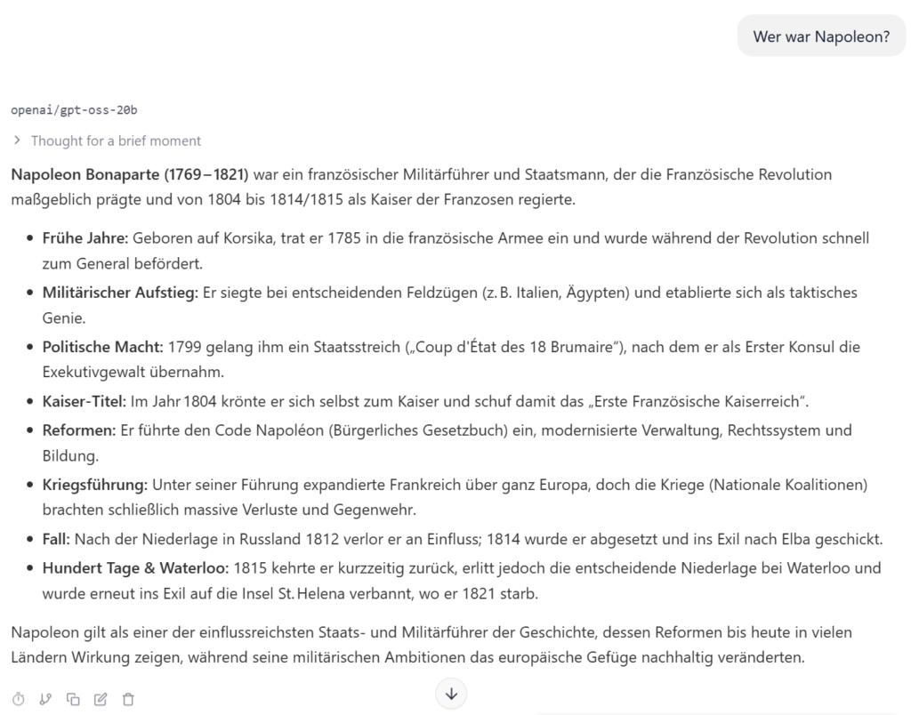 Der erste Test war simpel: Ein klassisches Gespräch über historische Themen, konkret über Napoleon Bonaparte. Hier konnte LM Studio seine Stärken ausspielen – die Antworten waren fundiert, gut strukturiert und inhaltlich korrekt.