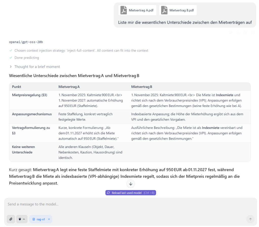 Deutlich anspruchsvoller war der zweite Test: Der Vergleich zweier Mietverträge. Hier musste das Modell nicht nur Dokumente analysieren, sondern auch Unterschiede herausarbeiten und strukturiert präsentieren. LM Studio meisterte auch diese Aufgabe überzeugend – die wichtigsten Abweichungen zwischen den Verträgen wurden klar erkannt und verständlich aufbereitet.