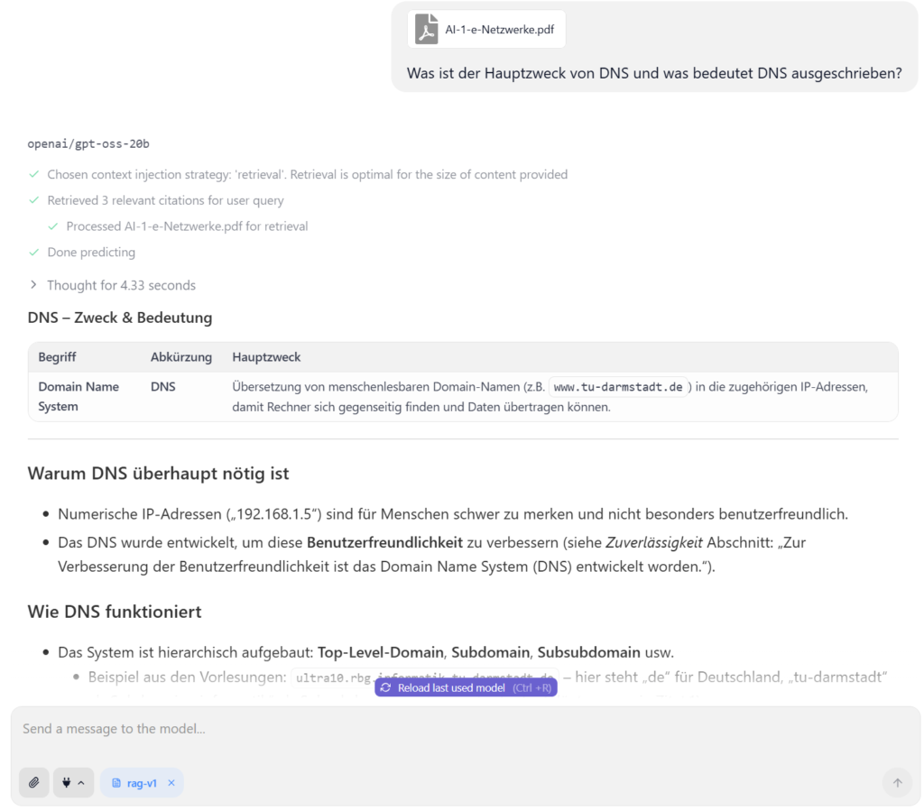 Im dritten Test habe ich ein komplexes PDF-Dokument zum Thema „Netzwerktechnik“ hochgeladen und spezifische Fragen dazu gestellt. Auch hier lieferte LM Studio zuverlässige Ergebnisse. Das Modell konnte relevante Informationen aus dem Dokument extrahieren und sinnvoll in seine Antworten einbinden.